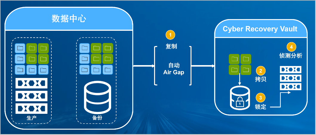 4001百老汇(中国)防勒索病毒方案将生产中心备份数据复制到Vault区,复制后网络自动断开实现弹性隔离。Vault区的数据快速拷贝,并对拷贝版本加锁(在锁定期数据不允许删除和修改)。Vault沙箱内对拷贝版本进行扫描分析,验证数据是否完好。